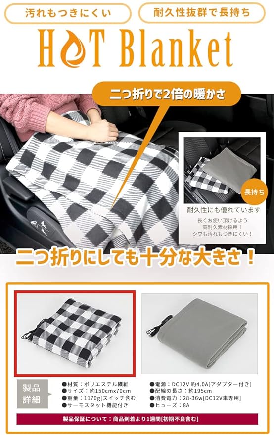 ユアーズ(Yours) 車用 ホット ブランケット 電気毛布 70cm 150cm [ モノトーン チェック ] シガーソケットに差し込むだけで暖かい 温度調節機能 車中泊 ひざ掛け ふんわり あったか もふもふ y212-005 [2] S