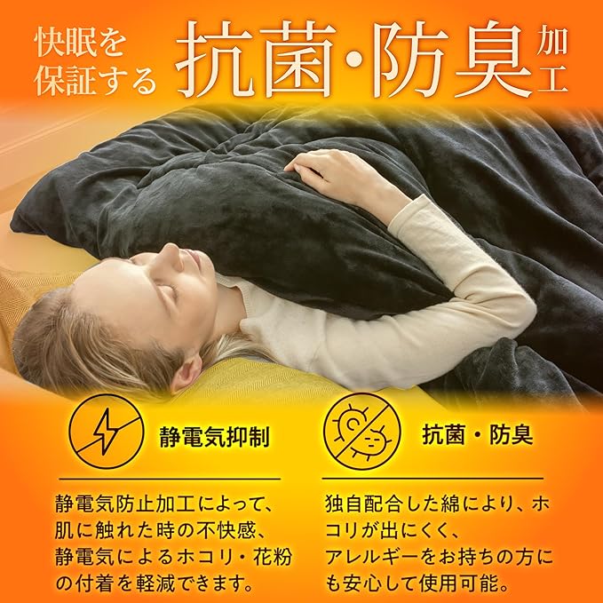 人生の1/3の時間を占める「睡眠」を徹底的に研究し、極上の眠りと、翌朝の目覚めさえもよりよくする寝具を作りたいという思いで企画開発。「高価な寝具には劣らない品質」と「寝心地」で、手に取って頂いた後も末永くご満足いただける商品を提供いたします。[商品詳細]●サイズ /約150x210cm ●製品重量(約)/3.1㎏ ●カラー/ブラック・グレー・ベージュ ●側生地/ポリエステル85%、レーヨン15% ●中綿/ポリエステル80%、アクリレート20%(アルミシート入り)、収納袋/ポリエステル100% ●収納サイズ※圧縮前(約)/31x33x46cm ●プレゼントに最適な高級化粧箱でお届け※SDGsの観点から、包装紙に包まずお届けとなります。●日本語取扱説明書(1年間保証書付き)●日本企業設計・開発・販売、中国専用工場生産