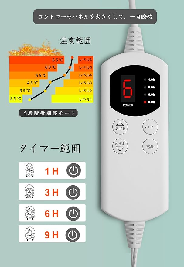 [6段階温度調整できる敷き電気マット] 温度段階を30℃~65℃の6段階に調節できます。温度が65 以上になった場合、長時間で使用すると、皮膚乾燥や低温やけどなどの恐れがあるので気を付けてください。