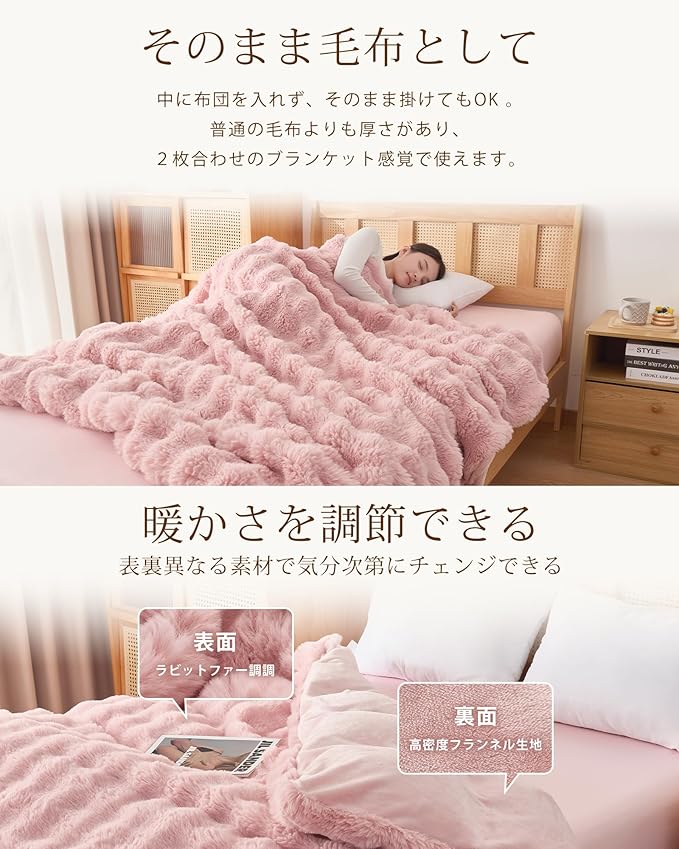 【プラス5℃蓄熱保温】480g/㎡高密度ラビットファー調生地とフランネルの組み合わせで、普通のフランネルカバーより、蓄熱保温効果が倍増!マイクロファイバーが高密度に詰まっており、毛足に空気を多く包み込んでいるため、暖かい空気をしっかりと閉じ込め、身体の熱を保持します。人体が放出するエネルギーを吸収し、布団内部の温度を上げ、熱を蓄えます。布団に入った瞬間、ふわふわぽかぽかな暖かさに包まれます。