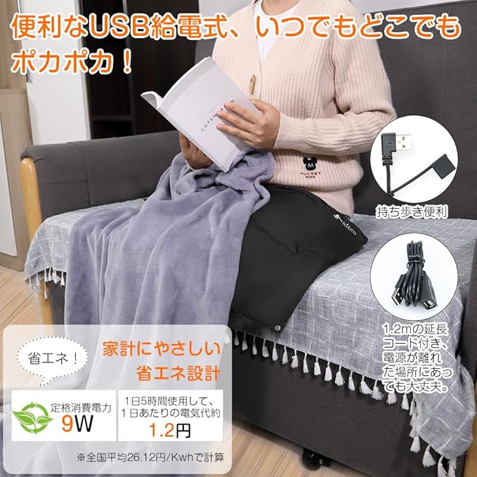 【USB給電式ホットマット・省エネ】便利なUSB給電式、モバイルバッテリー、PC等のUSBポートから簡単に給電。1.2mのUSB延長コードも付き、電源が離れた場所にあっても気軽に使えます。定格消費電力わずか9W、1日5時間の使用と想定して、1日あたりの電気代約1.2円、1ヶ月使用しても電気代36円と省エネ、とても経済的て家計にやさしい寒さ対策グッズです。※電源に出力5V/2AのUSB-ACアダプターを使用した場合 ※全国平均26.12円/Kwhで計算。