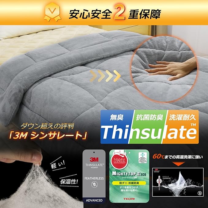 「3Mの奇跡!・羽毛より軽い灼熱保温」3Mが生む驚異の熱循環:羽毛より軽い、雲のような肌ざわり、体の凹凸に張り付くように密着、熱を10倍増幅します。しきぱっどの繊維構造で、雪山で裸寝できるレベルの保温性を実現!3Mシンサレート中綿は60℃までの高温洗濯に強い、何回洗濯しても保温性を損なわないです。