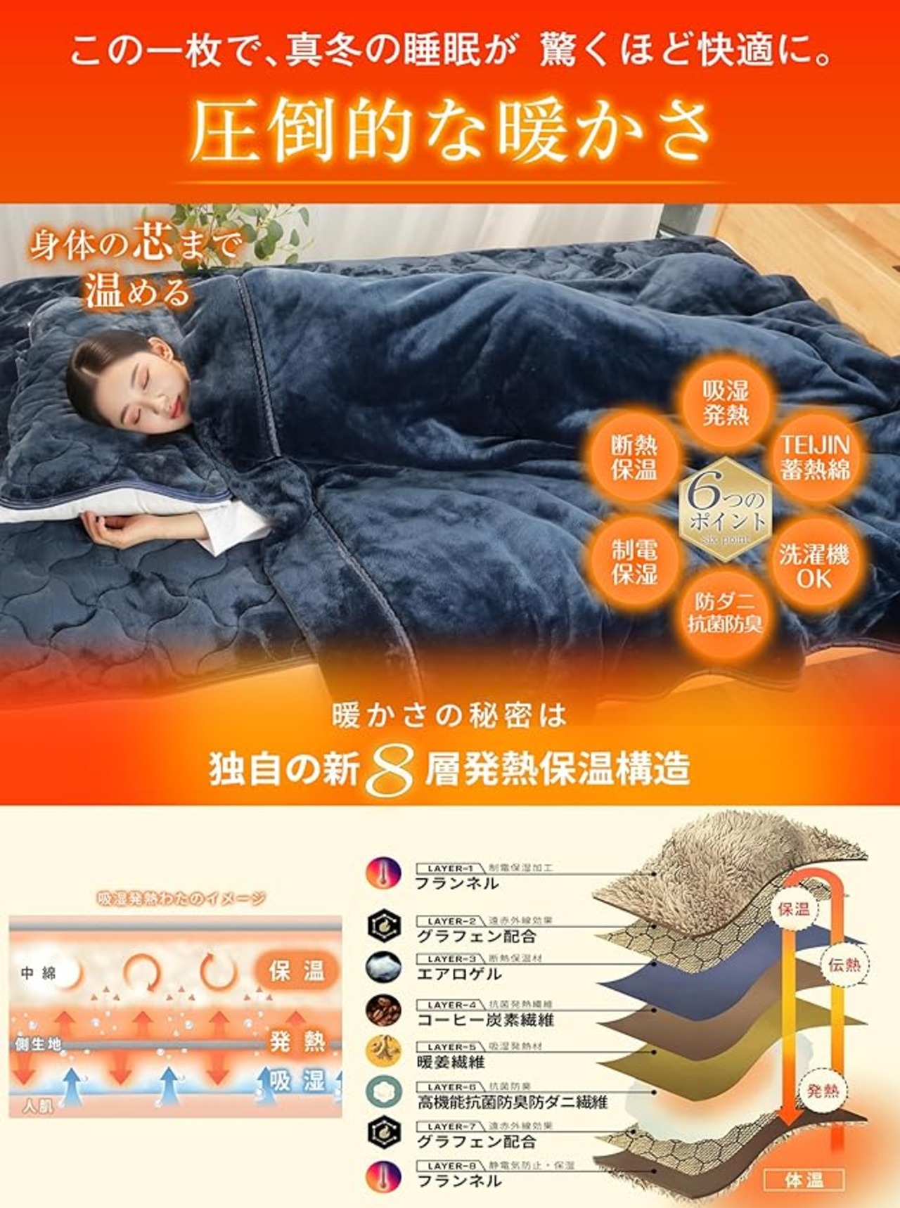 【一晩中持続する暖かさの秘密】は、研究に研究を重ね、こだわりぬいた独自の「新8層発熱保温断熱構造」です。①この瞬温シリーズ冬用あったか毛布の表層には、驚くほどなめらかな肌触りのマイクロファイバーを使用、ふわっと素肌に触れるたびに、極上の気持ちよさにとろけてしまうほど。②生地基布に「遠赤外発熱」「熱伝導性」「蓄熱保温」「抗菌防臭」特性を備えている奇跡のグラフェン素材配合しています。③『贅沢に詰め込んだのは、特別な中わた』の上層には、宇宙服に採用されている次世代断熱材『エアロゲル』層 「吸湿発熱」「蓄熱保温」「遠赤外発熱」「永久消臭」の特性を持ち、環境にもやさしい素材『コーヒー炭素繊維』を採用、中わたの下層には天然ショウガ成分配合の吸湿発熱新素材『暖姜繊維』と高機能抗菌防臭防ダニ繊維を採用しています。「吸湿発熱」 「遠赤外発熱」のわたが、寝ている間の汗を吸って暖かさに変え、しかもムレにくくなっているので、より保温性が高くなっています。圧倒的な暖かさを効率よく毛布全体に伝えて循環させるから、寒い冬でもあたたかさが保てます。