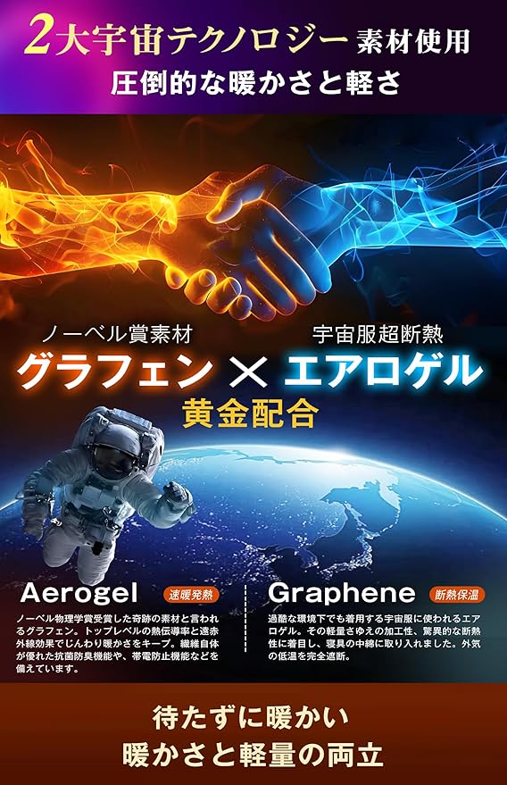 【6大テクノで、真冬の睡眠を「寒さ・蒸れ」フリーに!】宇宙服断熱素材「エアロゲル」と、ノーベル賞受賞「グラフェン」を黄金配合したこの冬用毛布は ——熱をしっかり閉じ込めつつ、外の寒気を一気に遮断。さらに遠赤外線を放射して迅速に発熱し、体の芯までじんわりと温めます。触れたその瞬間暖かさが肌に届き、「冷たい不安」が一瞬で和らぎます。さらに吸湿発熱のトップ級素材「アクリレート」を導入:ウールの2.5倍の発熱力で、体の湿気をすぐ熱に変え、一晩中足元までポカポカ。抜群な放湿性で汗や湿気を速やかに排出し、布団内の蒸れを根絶!抗菌消臭中わた「CLEAN MAX]と環境に配慮した「コーヒー炭素繊維」も搭載:Wの驚きの消臭機能で、汗臭や加齢臭を極力消臭!6つのテクノロジーを集結し、独自の8層魔法瓶構造で「速暖・発熱・保温・遮断」を極め —— 毛布内の超温環境を一晩中しっかり保ちます。暖房をつけなくても、真冬の夜を「寒さも蒸れもない」快適睡眠で過ごせます。