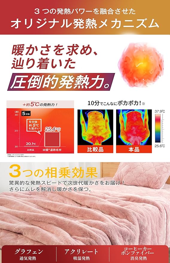 冬の「暖かさ」だけでなく「肌の潤い」も求めるなら、このW 極 モイストフレア潤暖寝具で、乾燥や低温による肌の悩みを一掃し、6つの先端テクノロジーが届ける「潤いあふれる暖かさ」を体感してください。独自に開発した業界初となる「持続保湿フランネル機能素材」は、分子レベルで保湿成分を繊維にしっかり定着させ、肌に薄い「潤いの膜」をかけたような体感をお届けします —— 毛布に入る瞬間、柔らかさが肌に寄り添い、寝ている間に自然に潤いを補給できるのです。 6大テクノで、真冬の睡眠を「寒さ・蒸れ」フリーに!宇宙服断熱素材「エアロゲル」と、ノーベル賞受賞の「グラフェン」を黄金配合したこの冬用毛布は ——熱をしっかり閉じ込めつつ、外の寒気を一気に遮断。さらに遠赤外線を放射して迅速に発熱し、体の芯までじんわりと温めます。さらに吸湿発熱のトップ級素材「アクリレート」を導入:ウールの3倍の発熱力で、体の湿気をすぐ熱に変え、一晩中足元までポカポカ。抜群な放湿性で汗や湿気を速やかに排出し、布団内の蒸れを根絶!抗菌消臭中わた「CLEAN MAX]と環境に配慮した「コーヒー炭素繊維」も搭載:Wの驚きの消臭機能で、汗臭や加齢臭を極力消臭!6 つのテクノロジーを集結し、独自の 8 層魔法瓶構造で「速暖・発熱・保温・遮断」を極め —— 毛布内の超温環境を一晩中しっかり保ちます。暖房をつけなくても、真冬の夜を「寒さも蒸れもない」快適睡眠で過ごせます!