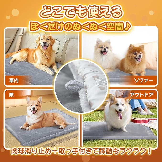 【すべり止め付きで安全安心!】ペットマットの裏面にはかわいい肉球柄の滑り止め加工付き。元気に動き回るわんこ・にゃんこが乗ってもずれにくく、安心・安全設計。ソファの上や床の上でも、ピタッと安定♪