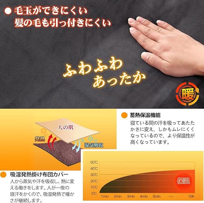 【あったか接触温感・蓄熱保温機能】肌ざわりのひみつ極細マイクロファイバーを高密度で編み上げた生地のカバーは布団に入った瞬間ヒャッと感がなく、入った瞬間からすぐに暖かさを感じる事できます。ほどよく暖かい空気を含んでくれますので、保温性が高くなっています。ぬくぬくの暖かさで、寒い時期には欠かせないアイテムです。