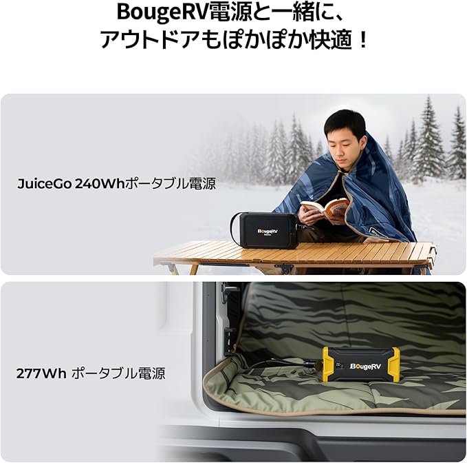 【多様なシーンで活躍】室内はもちろん、アウトドアキャンプ、アイスフィッシング、車中泊など、さまざまなシーンで活躍。BougeRVの277バッテリーやJuiceGo電源との組み合わせも可能です。【安心の品質保証】本製品はPSE認証を取得しており、品質と安全性を保証します。さらに、2年間の保証期間付きで、安心してお使いいただけます。