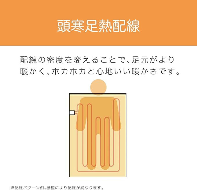 ●頭寒足熱配線:配線の密度を変えているので足元からホカホカと、カラダにやさしい暖かさです。