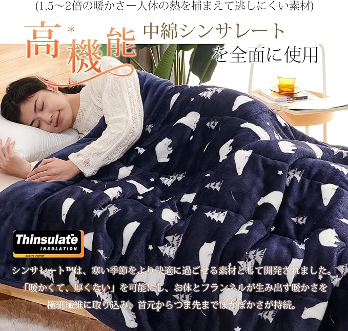【4層構造で保温力倍増!】上層と下層はなめらかな肌触りのフランネル毛布で、その間にシンサレート綿と吸湿発熱中綿を挟んでいる。2枚合わせのサンドイッチ構造だから優れた断熱効果があり、保温性もより良い。保温力たっぷりの冬用毛布!