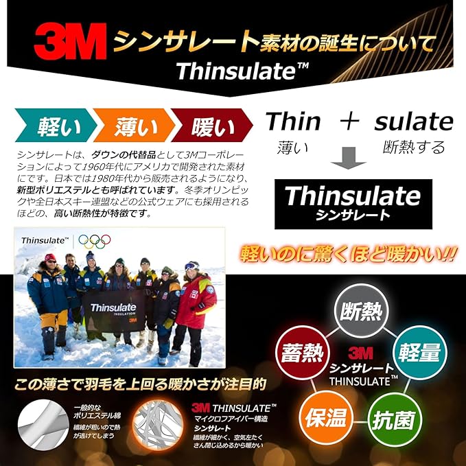 「3Mの奇跡!・羽毛より軽い灼熱保温」3Mが生む驚異の熱循環:羽毛より軽い、雲のような肌ざわり、体の凹凸に張り付くように密着、熱を10倍増幅します。しきぱっどの繊維構造で、雪山で裸寝できるレベルの保温性を実現!3Mシンサレート中綿は60℃までの高温洗濯に強い、何回洗濯しても保温性を損なわないです。
