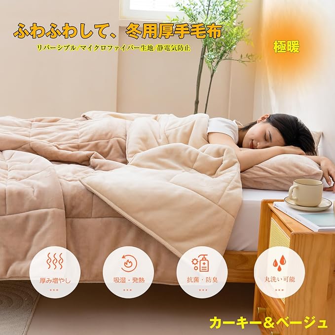 毛布 厚手 シングル 冬 あったか 二枚合わせ 超細マイクロファイバー 吸湿 保温 三重構造 リバーシブル 中綿入り 極厚 発熱 掛け布団ともなる 柔らかくてなめらか 静電気抑制 抗菌防ダニ ブランケット もうふ ふわふわ おしゃれ 無地 blanket (カーキー, シングル・140 200cm)