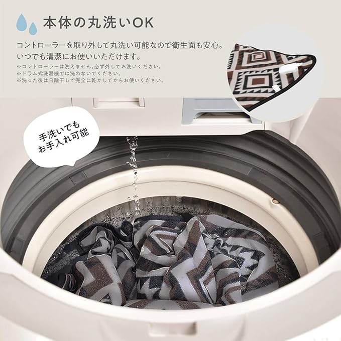●予熱機能・15分前に予熱して、暖かい布団で快適。●温度調節機能・4段階の温度調節機能。●タイマー設定・1〜8時間、1時間毎に設定可能。●丸洗い可能・コントローラーを必ず外して下さい。ドラム洗濯機では洗わないで下さい。
