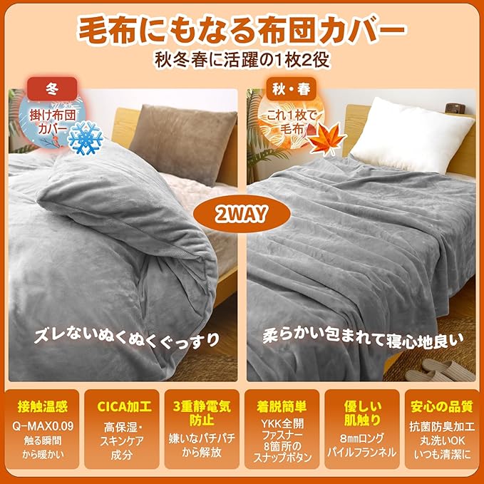 【ぬくもりを感じるQ-max0.09ロングパイル*究極の暖かさ】掛け布団カバーは接触温感値0.09の高密度極細、8mmのフランネル長毛素材を使用して、接触瞬間にその温かさと柔らかさに感動します。暖かい空気をしっかりと蓄え、体を包みこんですぐ温まってきます。
