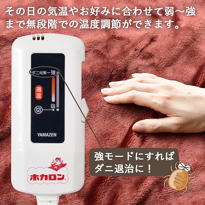 【温度調節】お好みに合わせて弱から強まで無段階で調節できます。その日の気温や体調に合わせて、お好みで調節してください。また、高温でダニを退治するダニ対策機能付きでアレルギーやぜんそくの原因にもなるダニをしっかり退治します。
